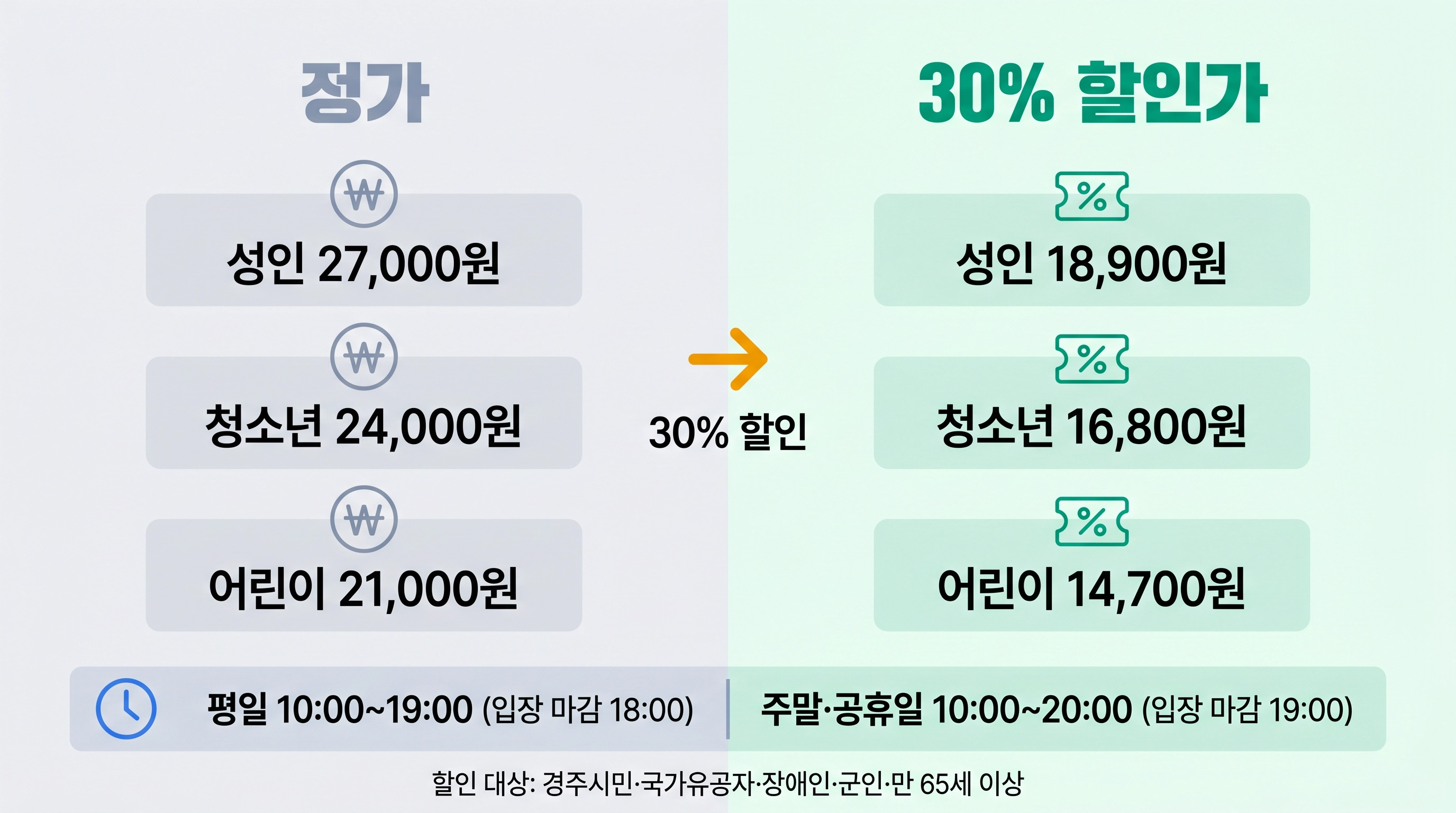 A1. 성인 27,000원, 청소년 24,000원, 어린이 21,000원입니다. 경주시민, 국가유공자, 장애인, 군인, 만 65세 이상 경로는 30% 할인이 적용됩니다. 할인 대상자는 해당 신분증 지참 필수이며, 유인 매표소를 이용해야 합니다. (2026년 4월 기준)
